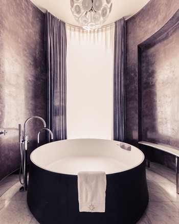 - Round bathtub & rainfall shower